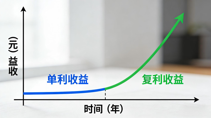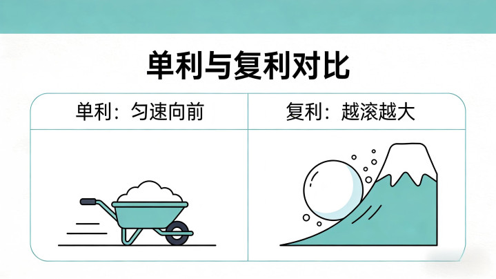 单利:你的本金生利息,利息不参与再生钱。比如100元,年利率5%,放3年,每年利息齐是5元,3年后所有有115元。 复利:你的本金生利息,利息加入本金,接续生利息,也便是咱们常说的“利滚利”。相似依然100元,5%复利,第一年本息105元,第二年以105元为基础繁殖,获取110.25元,第三年获取115.76元。 复利公式:最终金额 = 本金 × (1 + 收益率) ^ 时间 这个公式里,有三个身分:本金、收益率、时间。对于钱未几的咱们来说,本金(公式里的乘数)一运行很小,看起来不起眼。但实在具有魅力的是 “时间”,它处在指数位置。这意味着,时间的威力雄伟于初期本金的些许。 二、两个轰动对比:时间是若何打败财富的 光说表面不够,咱们来看两组足以篡改不雅念的对比。