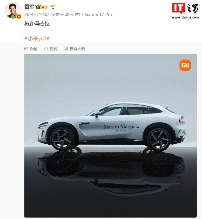 IT之家4月6日音讯,小米创办东说念主、董事长兼CEO雷军本日晒出了小米YU7梅森·马吉拉涂装版的外不雅。画面炫夸,该车继承专属极简白涂装+品牌记号磋议。