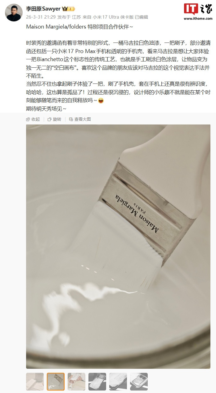 小米汽车工业磋议总司理、首席磋议师李田原在本年3月底曾解析过小米和MaisonMargiela/folders的相配名目协作,并晒出了小米17ProMax的定制磋议壳。