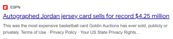 北京技巧4月24日,一张1997-98赛季UpperDeck比赛球衣系列迈克尔-乔丹卡面署名球星卡,内嵌1992年NBA全明星赛球衣切片,经戈尔丁拍卖行完成擅自来回,最终成交价高达425万好意思元,创下乔丹单东说念主球星卡历史最高成交记载。