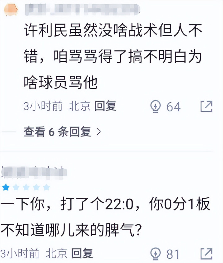 赛后球迷驳斥区,不少北京球迷亦然避重就轻对斯佩尔曼抒发了起火,力挺许利民:固然许利民一直不咋样,然而今天你也莫得履历指着他骂啊。典型的水平菜性情大!许钟豪说得没错,叫你是来打球的,不是来装的。一下你,打了个22:0,你0分1板不知谈哪来的性情?