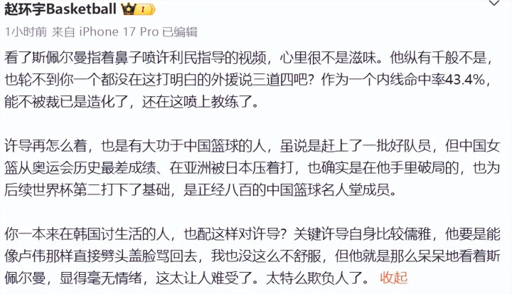 媒体东谈主赵环宇亦然平直发文开骂:看了斯佩尔曼指着鼻子喷许利民的视频,心里很不是味谈,他纵有万般不是,也轮不到你一个齐没在这打显豁的外助说三谈四吧?行为一个内线射中率43.4%,能不被裁已是造化了,还在这喷上阐述了。