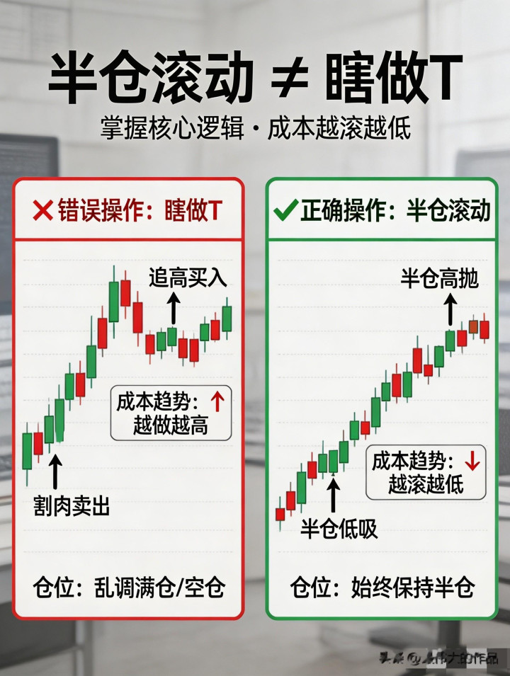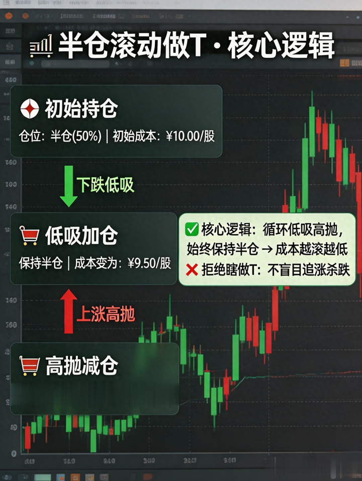 一、为什么主力最怕散户用半仓滚动? {jz:field.toptypename/}主力洗盘、拉升、出货的中枢逻辑,等于运用仓位短处收割散户。 - 你满仓:主力砸盘洗盘,你没资金补仓,只可割肉或硬扛,心态透顶崩溃; - 你空仓:主力拉升运行,你只可追高,本钱越来越高,最终接盘; - 你半仓滚动:底仓拿住趋势,现款搪塞波动,主力洗盘你低吸,主力拉升你高抛,越洗本钱越低,全齐打乱主力节律。 半仓滚动的骨子,是把主动权抓在我方手里,用“底仓+活泼仓”的组合,把T+1机制作念出类T+0成果,积小胜为大捷,这正是主力最不肯看到的操作形式。 二、半仓滚动中枢:一句话讲透,一看就懂 半仓滚动=50%底仓+50%活泼仓,永久不悦仓、永久不空仓。 - 底仓(50%):底仓不动,用来吃主升浪、吃趋势利润,独一个股基本面不恶化、趋势不破裂,坚定挣扎凡清仓; - 活泼仓(50%):用来作念差价、降本钱,涨了卖、跌了买,严格推行上下切换。 举个真实可感的例子: 10元例子: 10元本钱买入10000股,5000股底仓不动,5000股看成活泼仓。 - 股价涨到10.5元,卖出活泼仓5000股,锁定利润; - 股价回踩10.1元,接回5000股,仓位记忆半仓; - 一轮操作,股数没变,账户多出现款,持仓本钱被迫缩小。 独一震撼存在,就反复操作,哪怕每次只赚2%-3%,对峙10次、20次,本钱会持续下移,耐久对峙就能作念到负本钱持仓——这技艺股价哪怕跌回起初,你照旧是盈利情景。