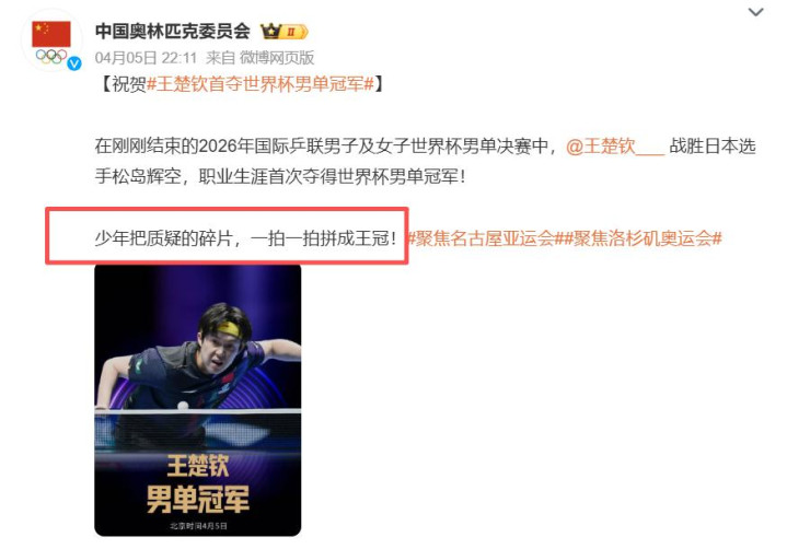 更让东说念主动容的是,比赛扫尾后,中国奥林匹克委员会第一技能发文祝贺王楚钦夺冠,用“少年把质疑的碎屑,一拍一拍拼成皇冠”这么充满力量的语言,确定了他的努力与付出。 这么的规格,远超旧例赛事的赛后通报,足以看出奥委会对这位年青选手的招供,也给足了国乒排面。