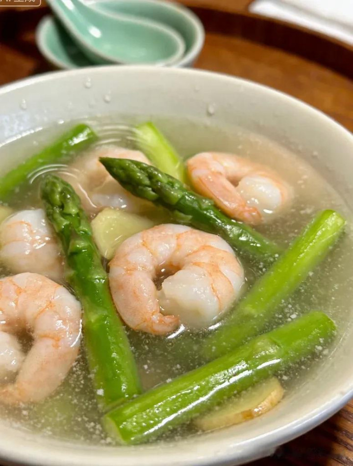 食材:大米六十克,小米四十克,核桃仁三颗,红枣四颗,净水足量 体式: 1.大米和小米搀杂在沿途,淘洗两到三遍,用净水浸泡二相等钟,煮出来更软糯出米油。 2.红枣洗净去核,切成小块,核桃仁掰成细微碎粒,便捷煮制和食用。 3.煮锅中加入足量净水,大火烧开后放入双米,轻轻搅动,肃穆粘锅糊底。 4.转小火慢熬三相等钟,待米粥出浓稠米油后,放入红枣块再熬煮相等钟。 5.临了加入核桃仁碎,链接煮五分钟,关火后焖八分钟,即可温热食用。 功效:核桃能养心健脑、补足心气,红枣补气养血,搭配杂粮仁和好消化,常喝能养快慰神、充盈气血,让腹黑更有活力,气色也会越来越好。 四 芦笋鲜虾仁清汤