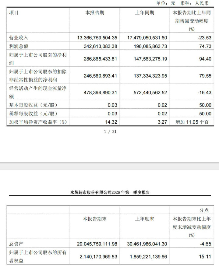 单季盈利难掩深层压力,永辉两年调改仍在深水区。 自2024年中启动“胖改”于今,两年时刻的政策减轻、供应链重构与商品体系升级,让永辉迎来转型以来首份正向财务答卷。 4月16日晚间,永辉超市(601933.SH)发布2025年全年以及2026年一季度财报。固然永辉超市2025年营收双位数下滑,耗损进一步扩大,但本年一季度其中枢商量标的全面向好。 申诉涌现,2026年第一季度公司实现交易收入133.67亿元,利润总和3.42亿元,同比大幅增长74.73%;归母净利润2.87亿元,同比飙升94.4%;扣非后归母净利润为2.47亿元,同比增长79.55%。